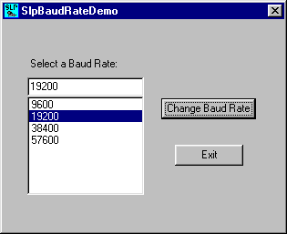 The SlpBaudRateDemo application creates a single dialog that has a Combo Box control for user to select a baud rate and change it by pressing "Change Baud Rate" button. You can follow the step by step instructions to create this application.