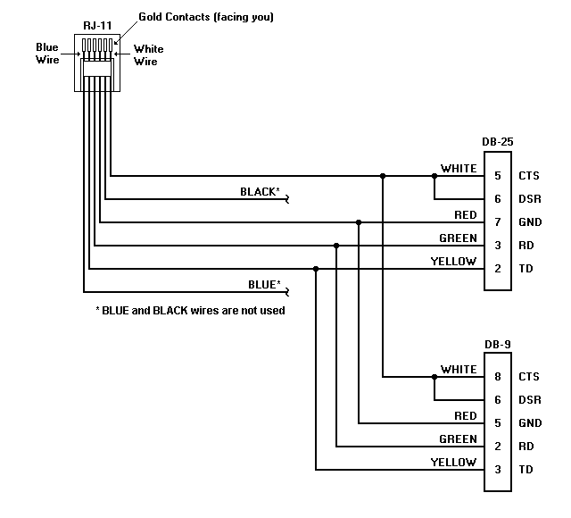 The SLP communicates with the host computer using an RS-232 serial cable. The cable connects the host computer’s TX, RX, CTS, DSR and GND signals to the printer via a standard RJ11 type (modular telephone) connector. The host end of the cable is intended for DTE connections using either a DB-25 or DB-9 connector. Older cables do not include connections for CTS and DSR because the SLP-1000 and SLP-1000P printers do not support hardware handshaking. A cable wiring diagram is shown in Figure 1.